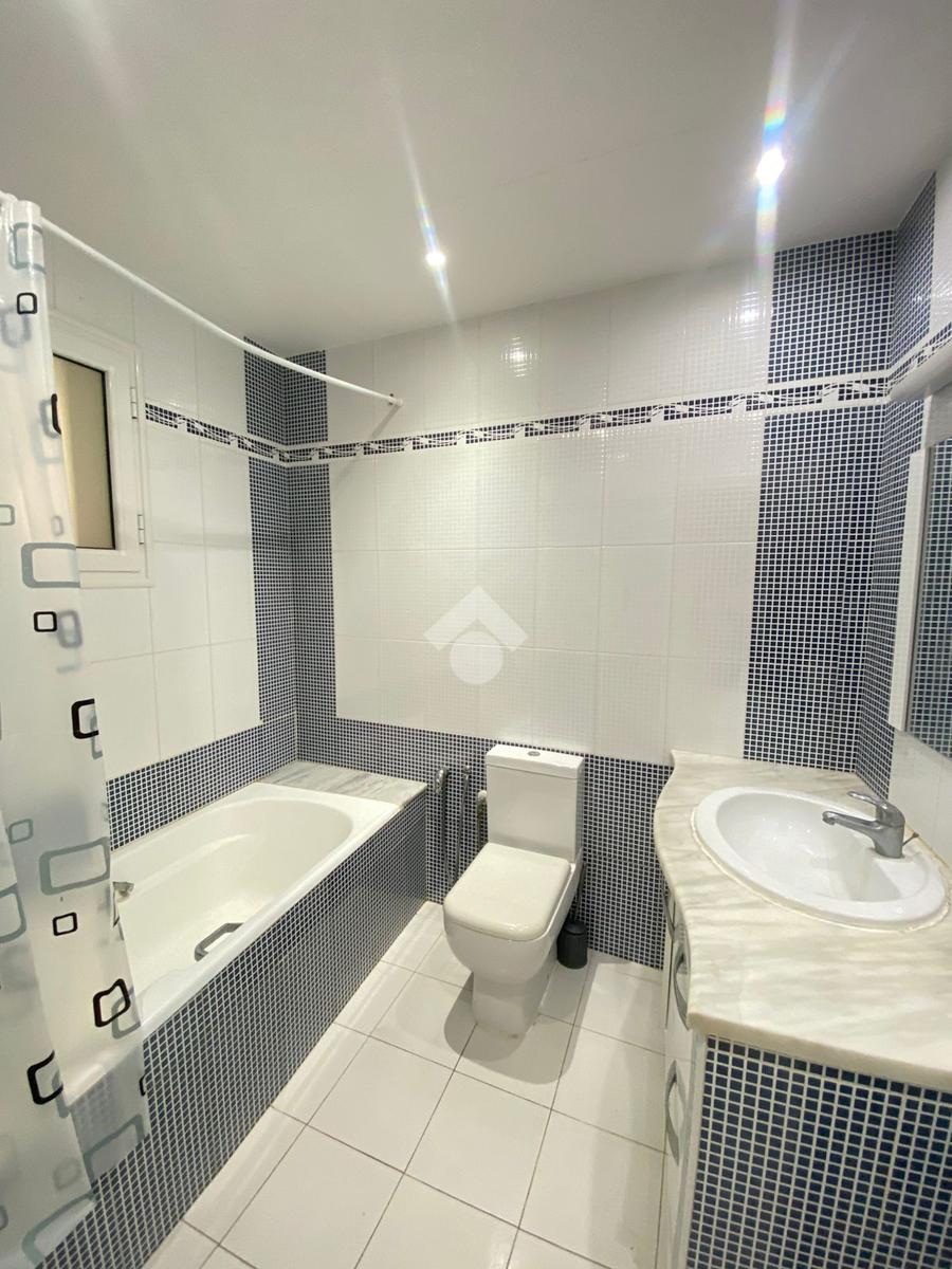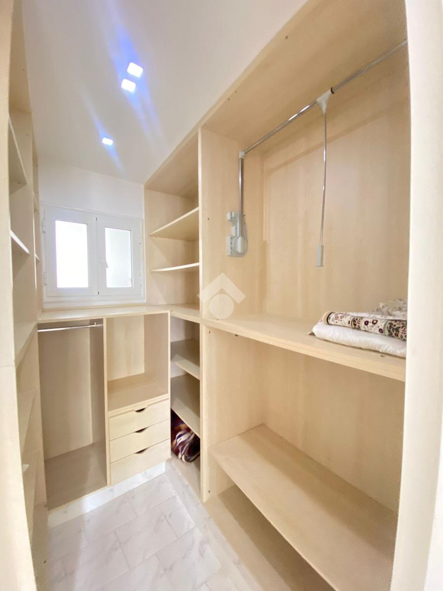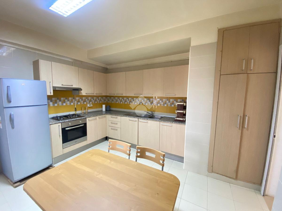 La cuisine est indépendante, moderne et entièrement équipée avec des éléments de rangement fonctionnels, une plaque de cuisson, une hotte aspirante, un four électrique, une machine à laver et un réfrigérateur. Elle s’ouvre sur un séchoir.