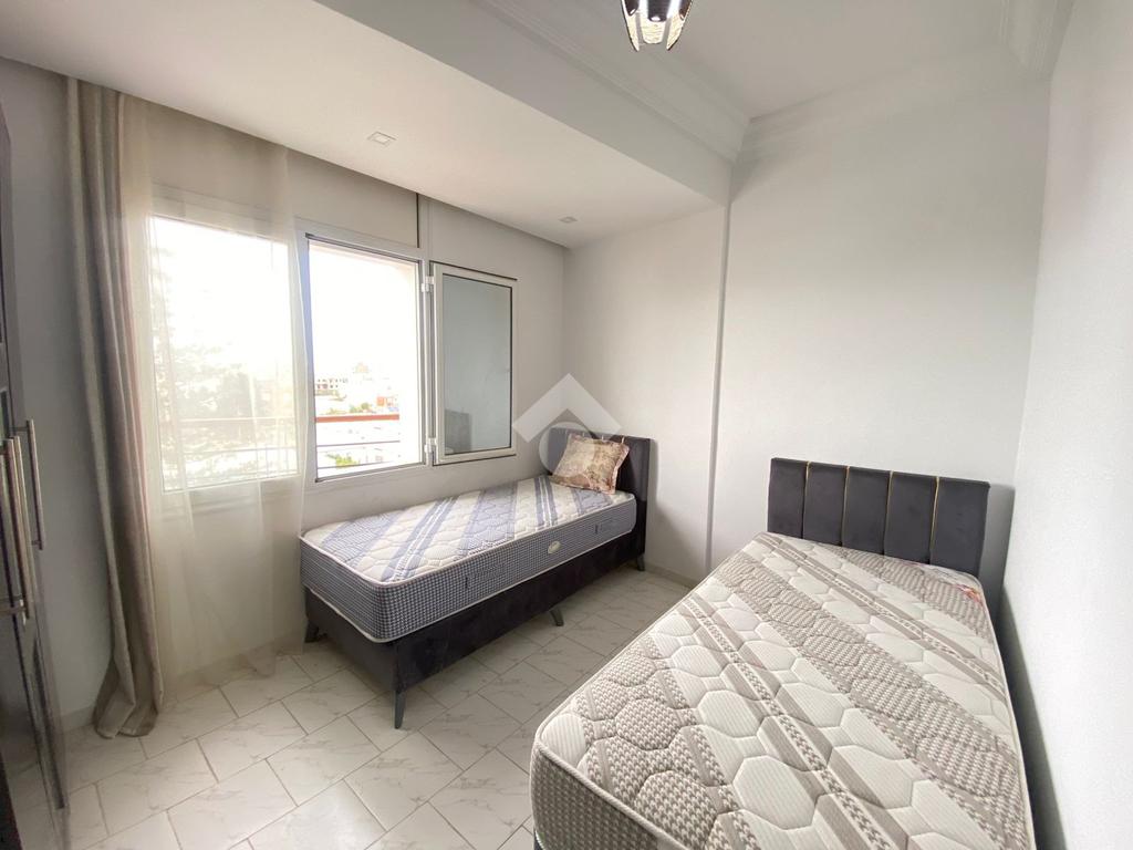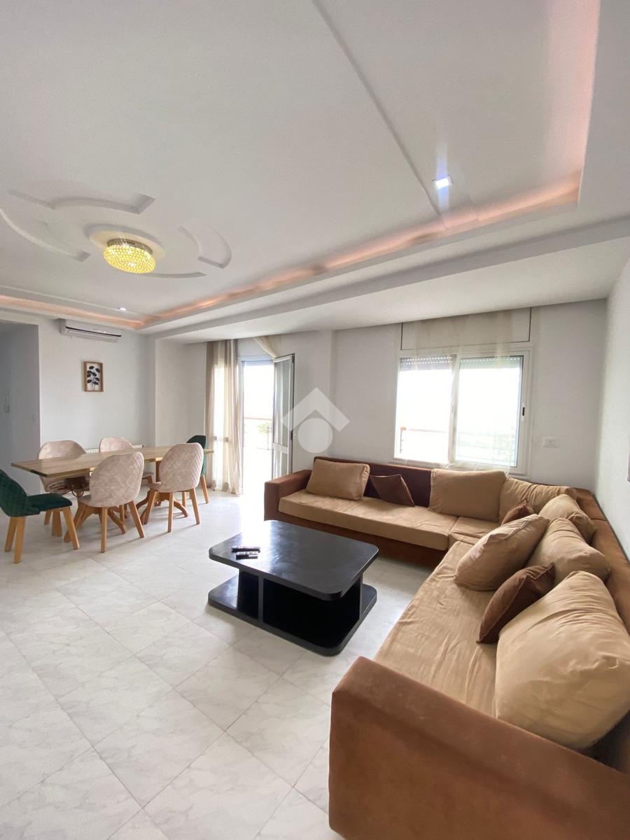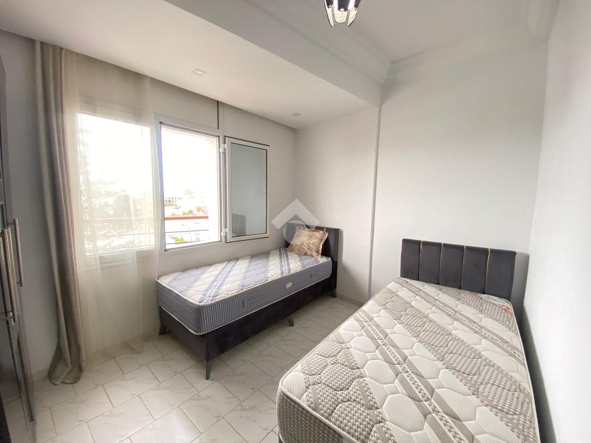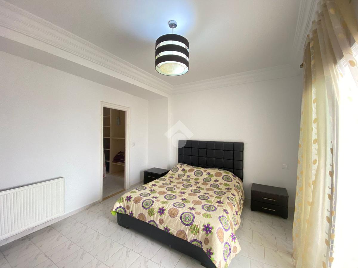 La cuisine est indépendante, moderne et entièrement équipée avec des éléments de rangement fonctionnels, une plaque de cuisson, une hotte aspirante, un four électrique, une machine à laver et un réfrigérateur. Elle s’ouvre sur un séchoir.